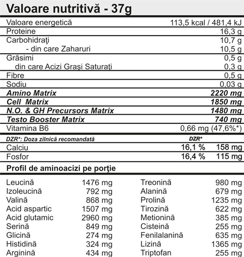 Isomaltuloză (Palatinose™ - IG 32), izolat proteic microfiltrat din zer, cazeinat de calciu, Gfx Gold Proprietary Blend (Cell Matrix - creatină monohidrată Creapure®, malat de di-creatină, etil ester malat de creatină, beta alanină; Amino Matrix - L-glutamină, BCAA (L-Leucină, L-Valină, L-Izoleucină), L-Tirozină, Taurină; N.O. & GH Precursors Matrix - L-arginină, L-arginină AKG, L-arginină aspartat, DL malat de L-citrulină, L-ornitină, L-ornitină AKG; Testo Booster Matrix - β-hydroxi β-methilbutirat de calciu (HMB), acid D-aspartic), izolat proteic din zer hidrolizat enzimatic, cacao, aromă ciocolată, îndulcitor natural: extract de ştevie, clorhidrat de piridoxină (vitamina B6).